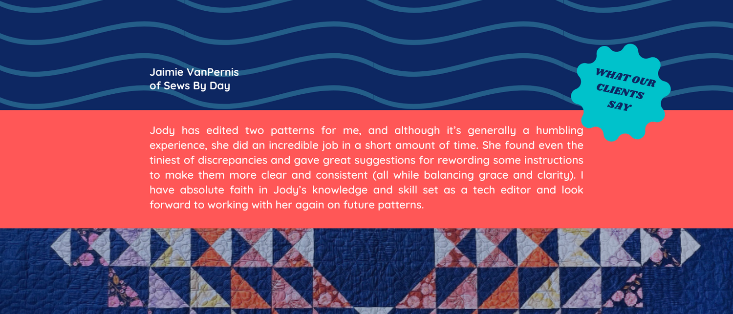 - Proofreading and editing your quilt pattern for grammar, spelling and typos.